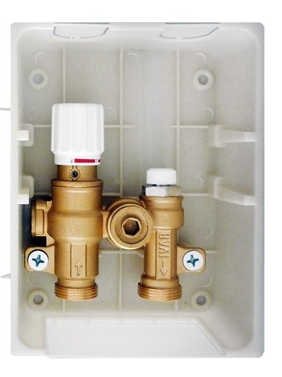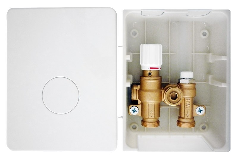 Комплектация: Монтажный короб с защитной крышкой, встроенный преднастраиваемый вентиль регулировки температуры обратного потока, вентильная вставка М 30х1,5, кран Маевского.Подключение 3/4" "евроконус".