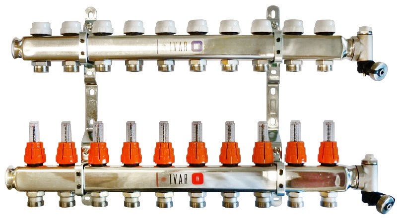 Коллектор с корпусом из нержавеющей стали, предназначен для распределения и контроля потоков воды или теплоносителя в отопительных системах, например в системе тёплый пол. Каждый коллектор проходит заводскую опрессовку , что является гарантией от производителя.