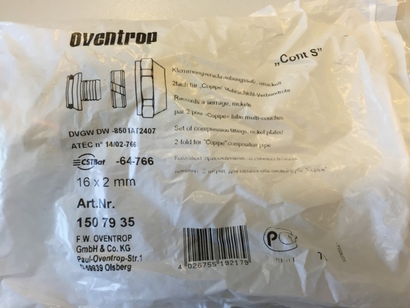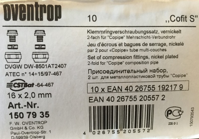 Присоединительные наборы Cofit S из латуни предназначены для присоединения радиаторной арматуры Oventrop с наружной резьбой 3/4" евроконус с металлопластиковой трубой 16х2,0. Не требует дополнительного уплотнения.