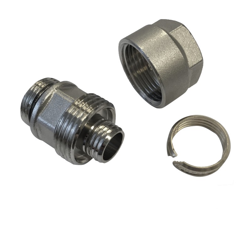 Компрессионные фитинги IVAR предназначены для непосредственного подключения магистральных труб к коллектору или запорной арматуре с резьбой M 3/4"(внутрення резьба). Состоят из упорной втулки (штуцера), зажимного кольца и никилированной накидной гайки. Материал: латунь. Максимальная рабочая температура – 110 ºC, номинальное давление – 10 бар.