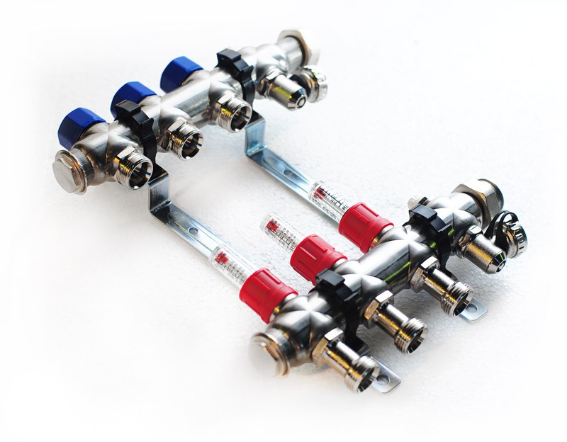 - подводящей магистрали в которую встроено по одному верхнему расходомеру на каждый отопительный контур,позволяющему точно и удобно отрегулировать расход воды не пользуясь инструментами,через cмотровое окошко можно проверять объём протекающей воды.